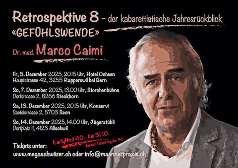 Ticketbestellung unter: www.megaschwiizer.ch oder info@maennerpraxis.ch EarlyBird 40.- bis 31.10., danach Ticket regulär 50. Hommage an den Humor Du bist die Sonne, die nicht untergeht; Du bist der Mond, der stets am Himmel steht; Du bist der Stern, der, wann die andern dunkeln, Noch überstrahlt den Tag mit seinem Funkeln; Cash only! Barzahlung vor Ort https://marcocaimi.ch […]