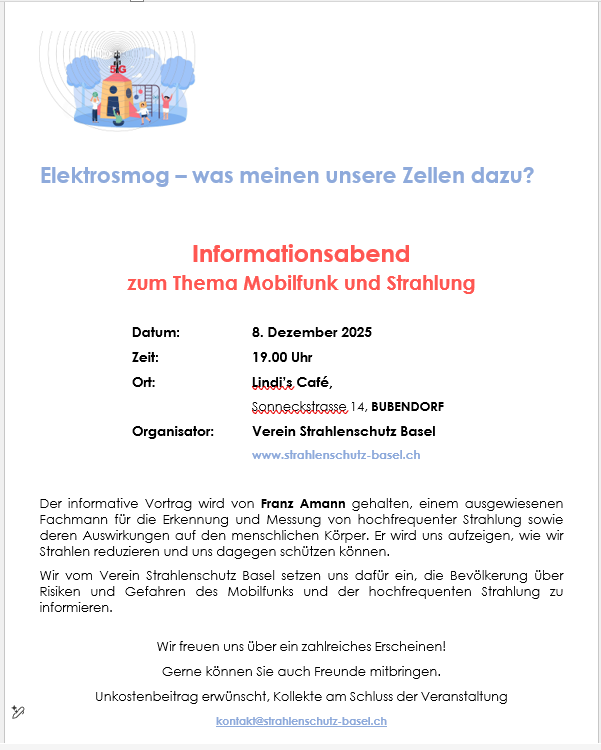 Der informative Vortrag wird von Franz Amann gehalten, einem ausgewiesenen Fachmann fur die Erkennung und Messung von hochfrequenter Strahlung sowie deren Auswirkungen auf den menschlichen Korper. Er wird uns aufzeigen, wie wir Strahlen reduzieren und uns dagegen schützen können. Wir vom Verein Strahlenschutz Basel setzen uns dafür ein, die Bevölkerung über Risiken und Gefahren des […]