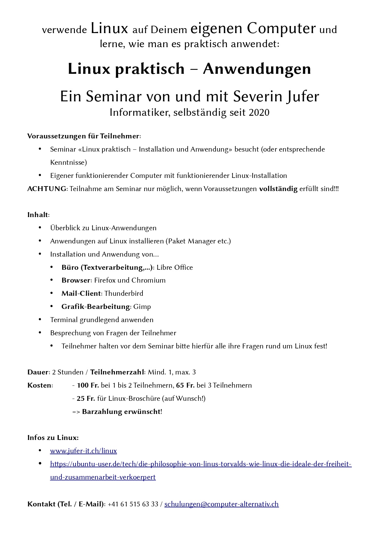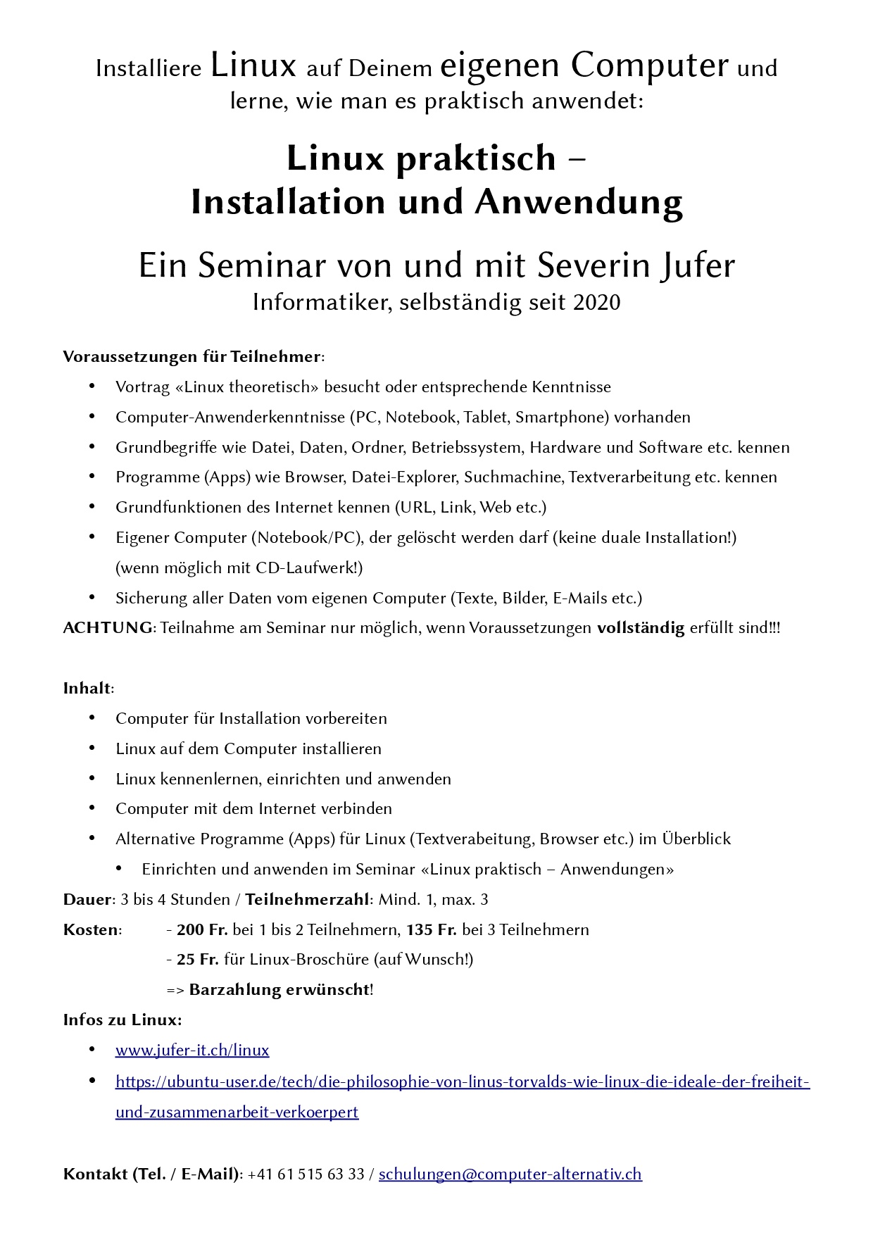 Bei Interesse am Seminar teilzunehmen, bitte einfach an schulungen@computer-alternativ.ch schreiben, dann schicken wir Euch alle Infos (Anmeldung, Inhalt, Voraussetzungen, Ort etc.). Linux ist die Alternative zu den Computer Betriebssystemen der Verbrecherkonzerne: Android (Google), macOS (Apple) und Windows (Microsoft). Es geht um in Verantwortung kommen und um Freiheit im wichtigen Lebensbereich Technik. Das Linux Seminar ist […]