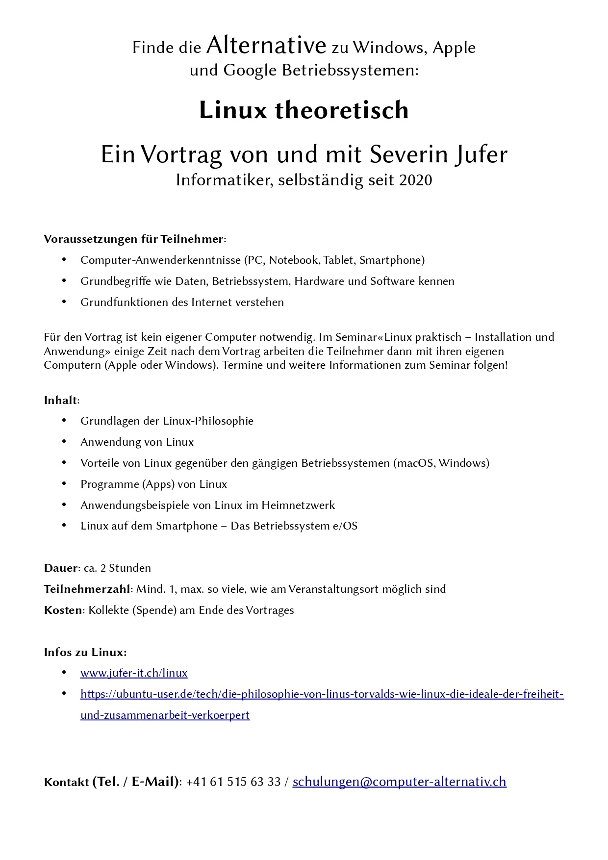 Bei Interesse am Vortrag teilzunehmen, bitte einfach an schulungen@computer-alternativ.ch schreiben, dann schicken wir Euch alle Infos (Anmeldung, Inhalt, Ort). Linux ist die Alternative zu den Computer Betriebssystemen der Verbrecherkonzerne: Android (Google), macOS (Apple) und Windows (Microsoft). Es geht um in Verantwortung kommen und um Freiheit im wichtigen Lebensbereich Technik. Der Linux Vortrag ist hierfür sehr […]