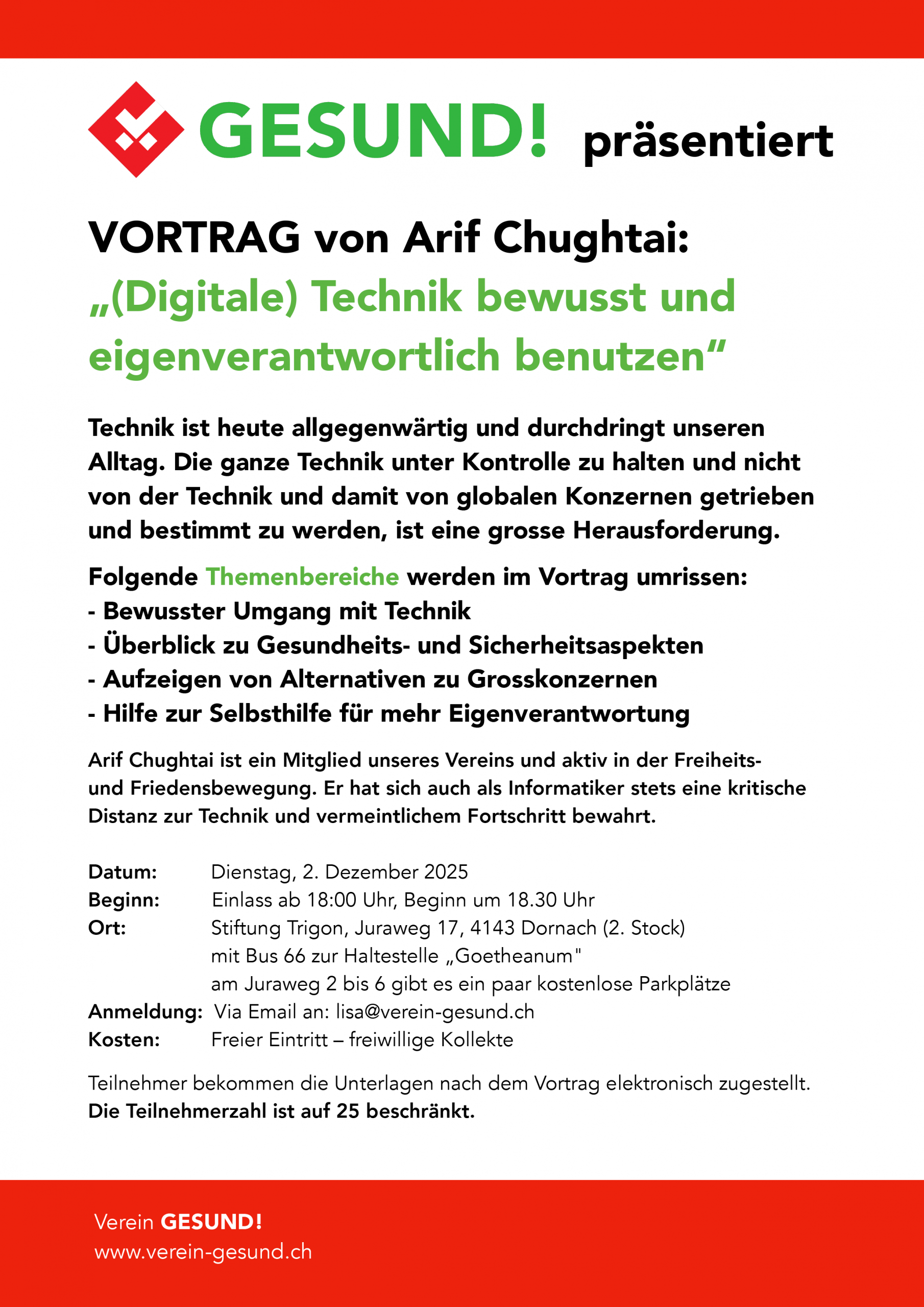 Technik ist heute allgegenwärtig und durchdringt unseren Alltag. Die ganze Technik unter Kontrolle zu halten und nicht von der Technik und damit von globalen Konzernen getrieben und bestimmt zu werden, ist eine grosse Herausforderung. Folgende Themenbereiche werden im Vortrag umrissen: - Bewusster Umgang mit Technik - Überblick zu Gesundheits- und Sicherheitsaspekten - Aufzeigen von Alternativen […] |