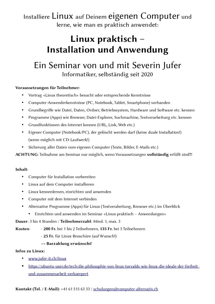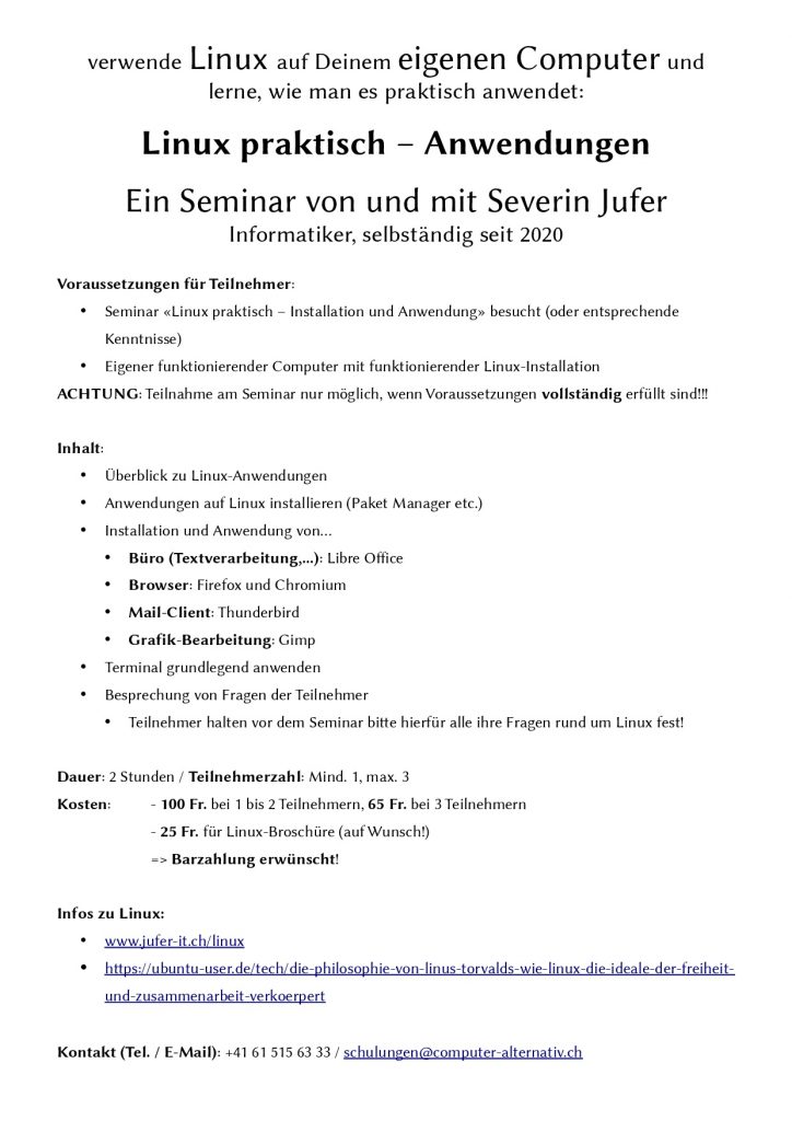 Bei Interesse am Seminar teilzunehmen, bitte einfach an schulungen@computer-alternativ.ch schreiben, dann schicken wir Euch alle Infos (Anmeldung, Inhalt, Voraussetzungen, Ort etc.).