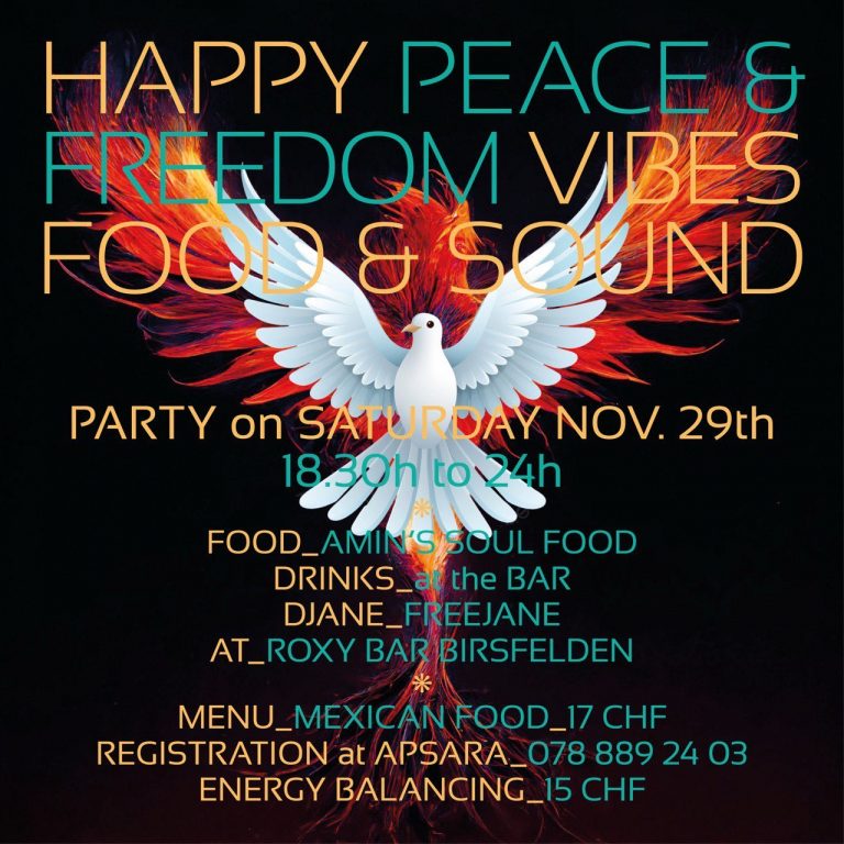HAPPY PEACE & FREEDOM VIBES FOOD & SOUND PARTY on SATURDAY NOV. 29th 18.30h to24h FOOD_AMIN’S SOUL FOOD DRINKS_at the BAR DJANE_FREEJANE AT_ROXY BAR BIRSFELDEN MENU_MEXICAN FOOD_17 CHF REGISTRATION at APSARA 078 889 24 03 ENERGY BALANCING_15 CHF