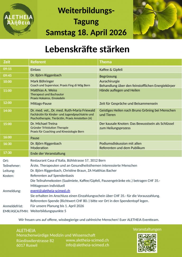 Restaurant Casa d’Italia, Bühlstrasse 57, 3012 Bern Ärzte, Therapeuten und an Gesundheitsthemen interessierte Menschen Dr. Björn Riggenbach, Christine Braun, ZA Matthias Bacher Referenten auf Spendenbasis Die Teilnahmekosten (Saalmiete, Kaffee/Gipfeli, Pausengetränke etc.) betragen CHF 35.- Mittagessen individuell event@aletheia-scimed.ch Sie erhalten im…