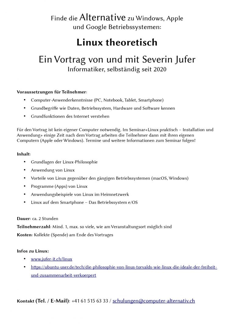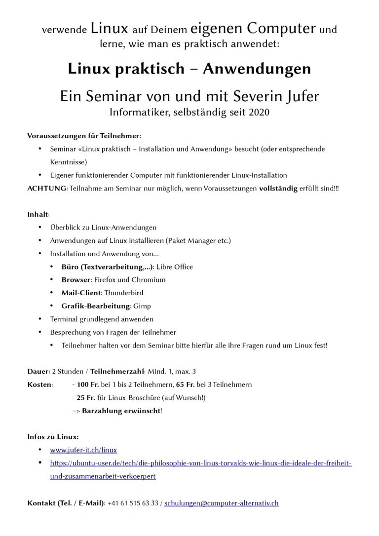 Bei Interesse am Seminar teilzunehmen, bitte einfach an schulungen@computer-alternativ.ch schreiben, dann schicken wir Euch alle Infos (Anmeldung, Inhalt, Voraussetzungen, Ort etc.). Linux ist die Alternative zu den Computer Betriebssystemen der Verbrecherkonzerne: Android (Google), macOS (Apple) und Windows (Microsoft). Es geht…