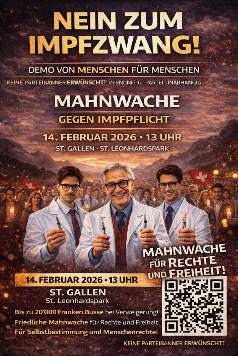 Neutrale Demonstration für Selbstbestimmung und Freiwilligkeit im Gesundheitsbereich Am Samstag, 14. Februar 2026, findet in St. Gallen eine bewilligte Demonstration (Kundgebung) statt. Initiiert wird sie von parteilosen St. Galler Einwohnerinnen und Einwohnern, die sich keiner politischen Partei oder Organisation zuordnen.…