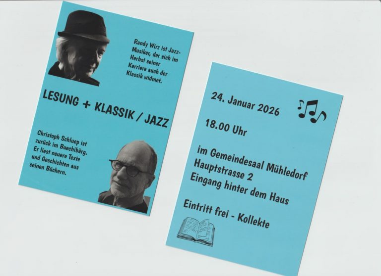 Randy Wirz ist Jazz-Musiker, der sich im Herbst seiner Karriere auch der Klassik widmet. Christoph Schluep ist zurück im Buechibärg. Er liest neuere Texte und Geschichten aus seinen Büchern. 24. Januar 2026 18.00 Uhr LESUNG + KLASSIK / JAZZ im…