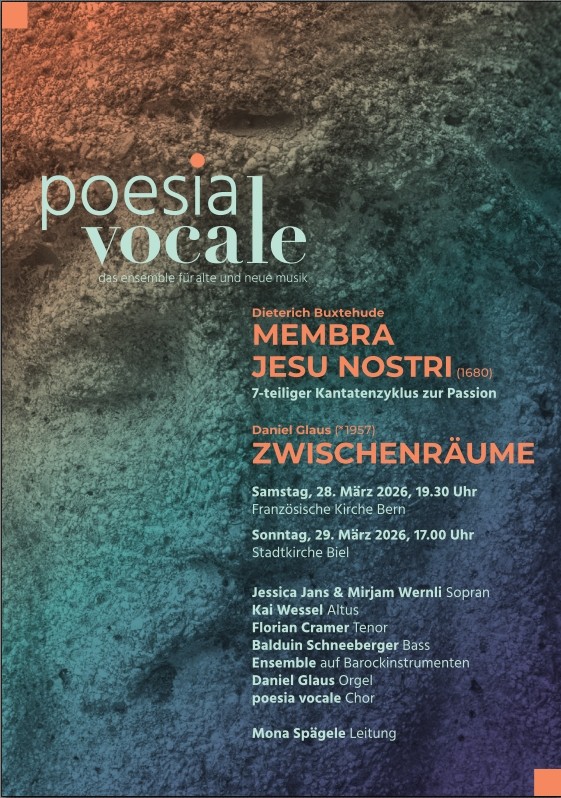 Französische Kirche Bern Zeughausgasse 8, Bern, BE, SwitzerlandDietrich Buxtehude Membra Jesu Nostrie 7-teiliger Kantatenzyklus zur Passion Daniel Claus Zwischenräume Vorverkauf ab 1.2.2026 bei poesiavocale.ch und bei Orell Füssli Bern: CHF 50.-/40.-/30.- Biel: CHF 40.-/30.-
