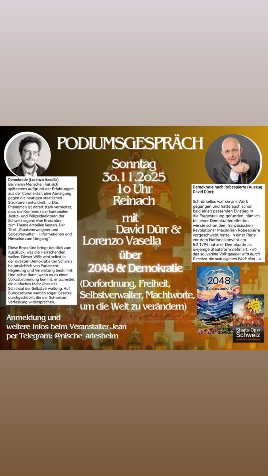 Reinach BL Reinach, BL, SwitzerlandPODIUMSGESPRÄCH Sonntag 30.11.2025 1o.00 Uhr Reinach David Dürr & Lorenzo Vasella über 2048 & Demokratie (Dorfordnung, Freiheit, Selbstverwalter, Machtworte, um die Welt zu verändem) Anmeldung und weitere Infos beim Veranstalter Jean per Telegram: @nische_arlesheim