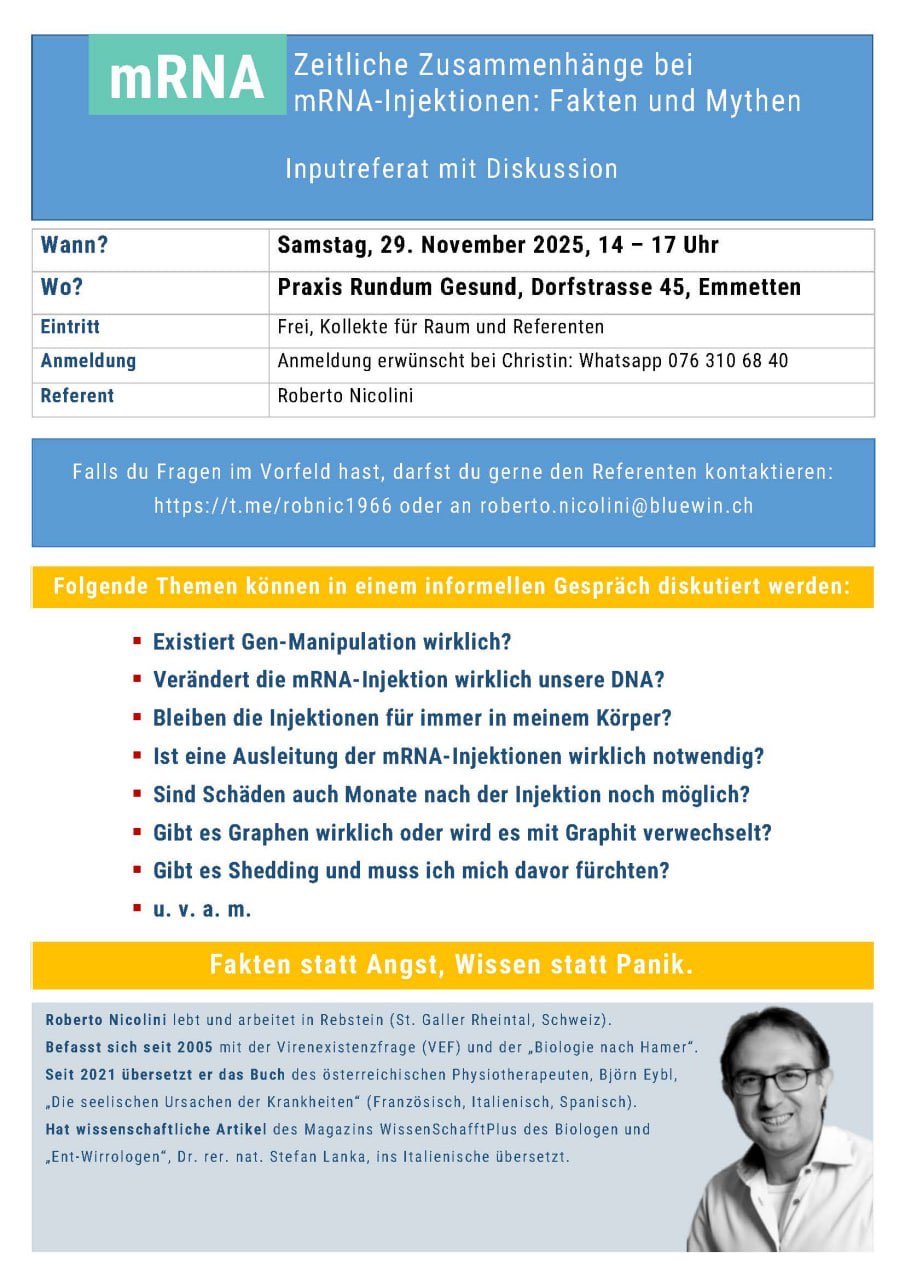 Praxis Rundum Gesund Dorfstrasse 45, Emmetten, LU, SwitzerlandZeitliche Zusammenhänge bei mRNA-Injektionen: Fakten und Mythen Inputreferat mit Diskussion Praxis Rundum Gesund, Dorfstrasse 45, Emmetten Anmeldung erwünscht bei Christin: Whatsapp 076 310 68 40 Referent: Roberto Nicolini Falls du Fragen im Vorfeld hast, darfst du gerne den Referenten kontaktieren: https://t.me/robnic1966 oder an roberto.nicolini@bluewin.ch Folgende Themen können in einem informellen Gespräch diskutiert werden: · Existiert […]
