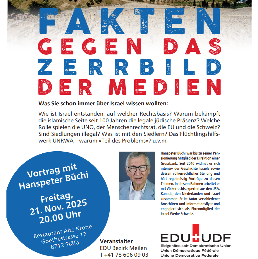 Restaurant Alte Krone Goethestrasse 12, Stäfa, SwitzerlandWas Sie schon immer über Israel wissen wollten: Vortrag mit Hanspeter Büchi Wie ist Israel entstanden, auf welcher Rechtsbasis? Warum bekämpft die islamische Seite seit 100 Jahren die legale jüdische Präsenz? Welche Rolle spielen die UNO, der Menschenrechtsrat, die EU und die Schweiz? Sind Siedlungen illegal? Was ist mit den Siedlern? Das Flüchtlingshilfswerk UNRWA – […]
