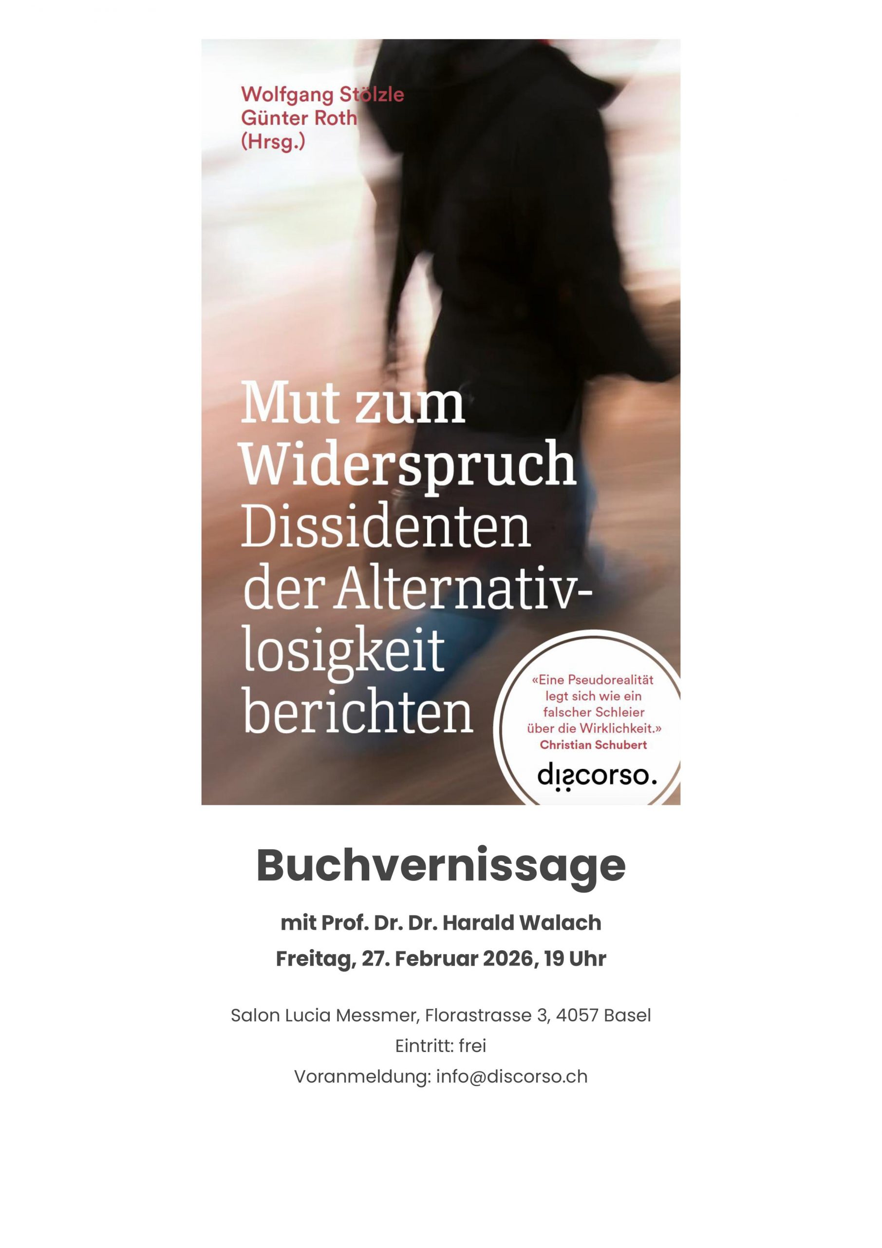 Lucia Messmer Florastrasse 3, Basel, BS, SwitzerlandMut zum Widerspruch Dissidenten der Alternativ-losigkeit berichten. Buchvernissage mit Prof. Dr. Dr. Harald Walach Freitag, 27. Februar 2026, 19 Uhr Salon Lucia Messmer, Florastrasse 3, 4057 Basel Eintritt: frei Voranmeldung: […]