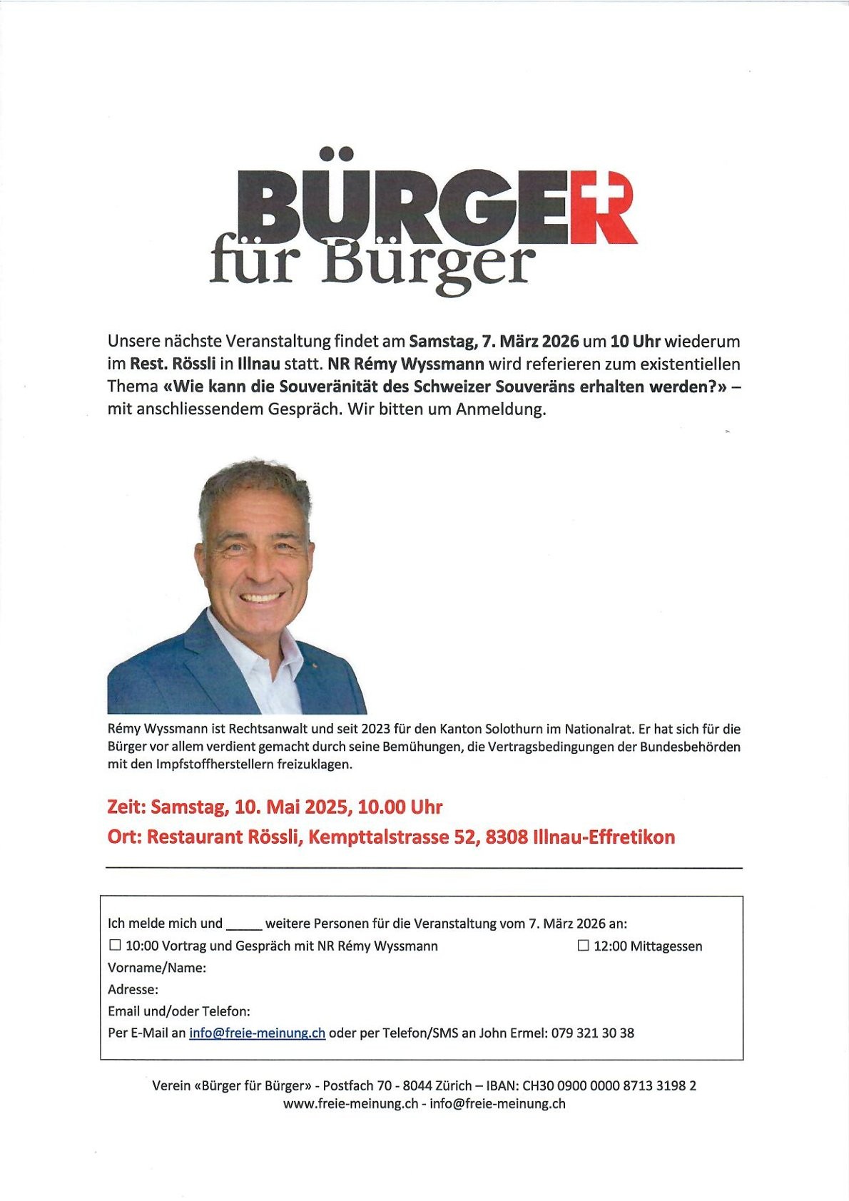 Restaurant Rössli Kempttalstrasse 52, Ill, ZH, SwitzerlandNationalrat Rémy Wyssmann wird referieren zum existentiellen Thema "Wie kann die Souveränitöt des Schweizer Souveräns erhalten werden?" - mit anschliessendem Gespräch. Wir bitten um Anmeldung