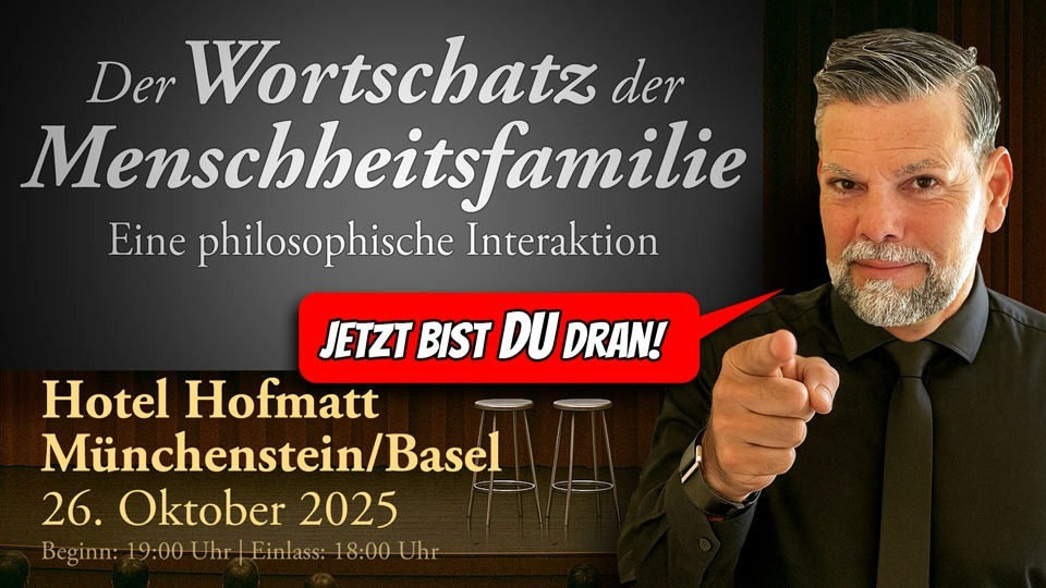 Hotel Hofmatt Baslerstrasse 88, Münchenstein, BL, SwitzerlandEventstitel Kayvan Soufi-Siavash - Der Wortschatz der Menschheitsfamilie - Jetzt bist Du dran! Eventsbeschreibung Kayvan Soufi-Siavash alias Ken Jebsen präsentiert: „Der Wortschatz der Menschheitsfamilie - Jetzt bist Du dran!" Ein philosophisch, interaktives Gemeinschaftserlebnis, bei dem das Publikum im Mittelpunkt steht: gemeint bist DU! Raus aus der Masse, rauf auf die Bühne! Sprich mit Kayvan über […]
