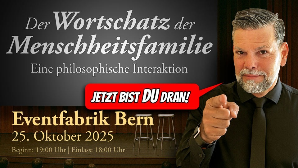 Eventfabrik Bern Fabrikstrasse 12, Bern, SwitzerlandEventstitel Kayvan Soufi-Siavash - Der Wortschatz der Menschheitsfamilie - Jetzt bist Du dran! Eventsbeschreibung Kayvan Soufi-Siavash alias Ken Jebsen präsentiert: „Der Wortschatz der Menschheitsfamilie - Jetzt bist Du dran!" Ein philosophisch, interaktives Gemeinschaftserlebnis, bei dem das Publikum im Mittelpunkt steht: gemeint bist DU! Raus aus der Masse, rauf auf die Bühne! Sprich mit Kayvan über […]