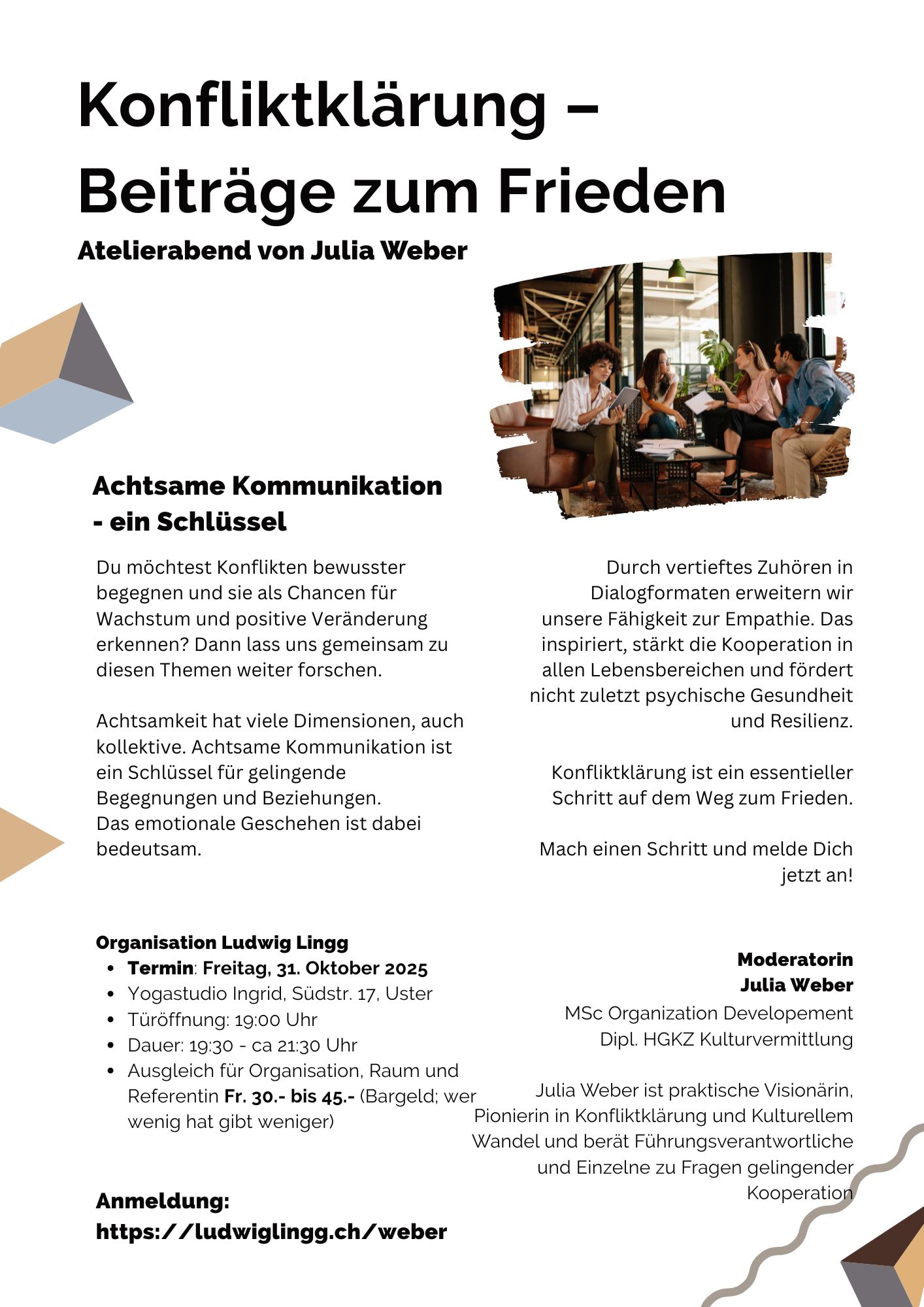 Ingrids Yogastudio Südstrasse 17, Uster, ZH, SwitzerlandAtelierabend mit Julia Weber: Konfliktklärung – Beiträge zum Frieden Du möchtest Konflikten bewusster begegnen und sie als Chancen für Wachstum und positive Veränderung erkennen? Dann lass uns gemeinsam zu diesen Themen weiter forschen. Achtsamkeit hat viele Dimensionen, auch kollektive. Achtsame Kommunikation ist ein Schlüssel für gelingende Begegnungen und Beziehungen. Das emotionale Geschehen ist dabei bedeutsam. […]