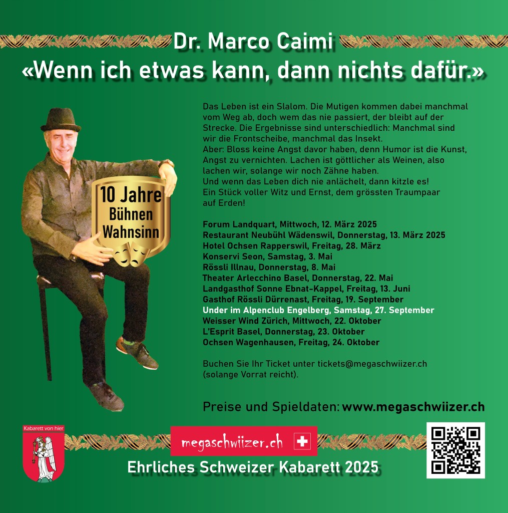 L'ESPRIT, Pfarreizentrum Thiersteinerallee 51, Basel, BS, SwitzerlandLiebe Freunde Die Zeit rast, schon sind wir wieder im 4.Quartal des aktuellen Jahres. Und auch meine reguläre Kabarett-Tour, resp. mein zehnjähriges Bühnenjubiläum neigt sich dem Ende entgegen: Noch drei Auftritte in Zürich, Basel und Wagenhausen b. Stein a. Rhein. Im Dezember dann wieder wie jedes Jahr die Retrospektive – der bissige kabarettistische Jahresrückblick. Zum […]