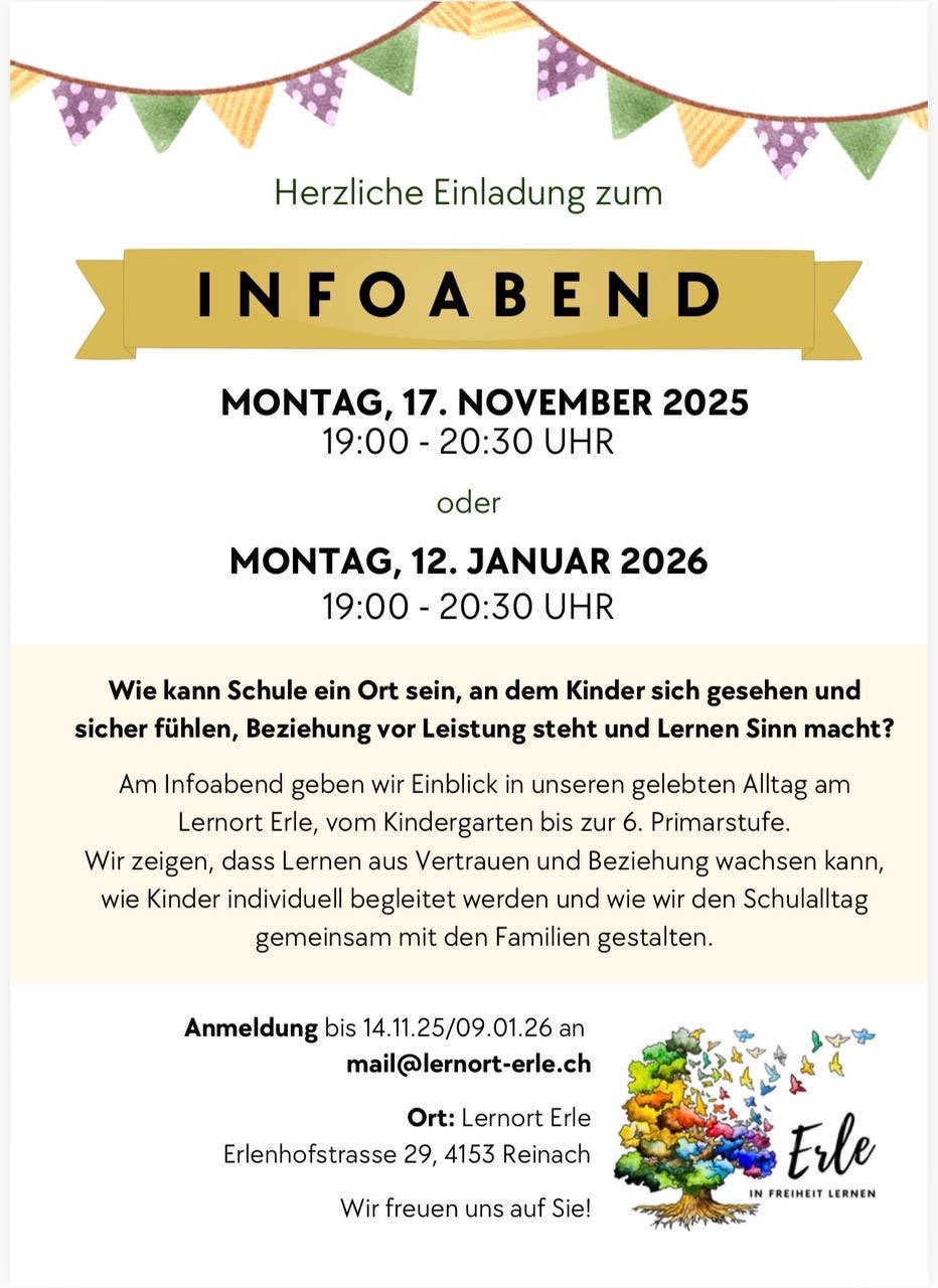 Wie kann Schule ein Ort sein, an dem Kinder sich gesehen und sicher fühlen, Beziehung vor Leistung steht und Lernen Sinn macht? Am Infoabend geben wir Einblick in unseren gelebten Alltag am Lernort Erle, vom Kindergarten bis zur 6. Primarstufe. Wir zeigen, dass Lernen aus Vertrauen und Beziehung wachsen kann, wie Kinder individuell begleitet werden […] |