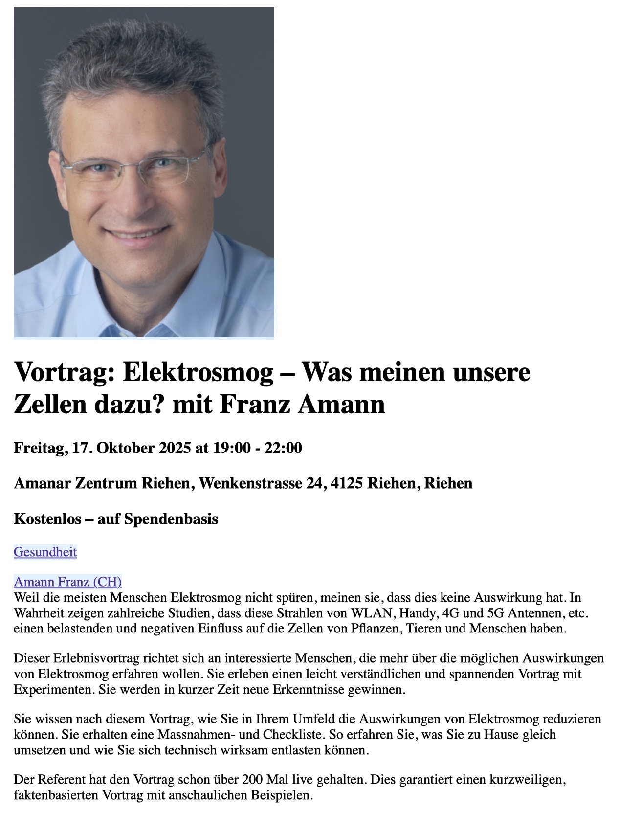 Okt. 17 19:00 - 22:00 Eledktrosmog – Was meinen unsere Zellen dazu? Amanar Zentrum Riehen Wenkenstrasse 24, Riehen Veranstaltung Details Wegbeschreibung